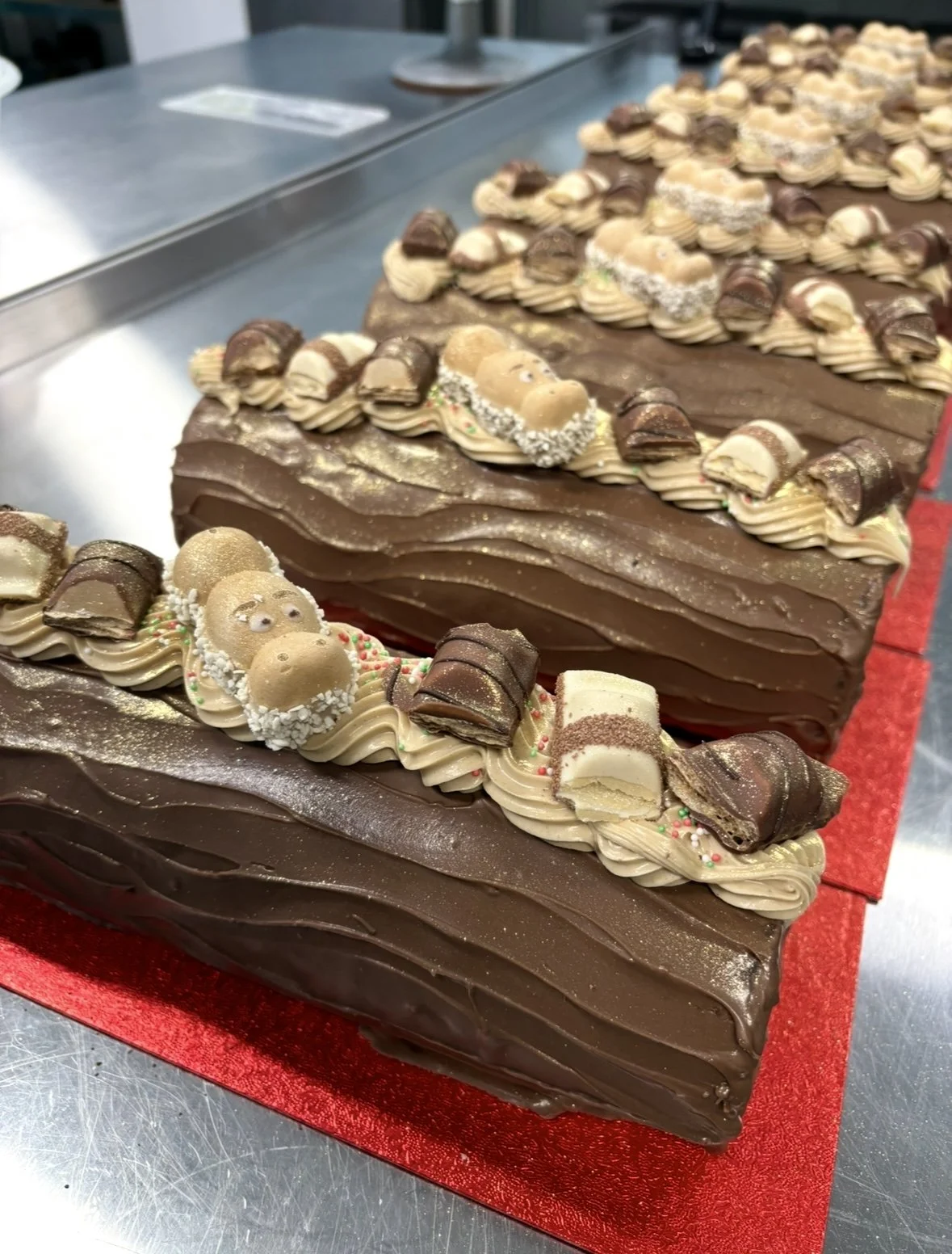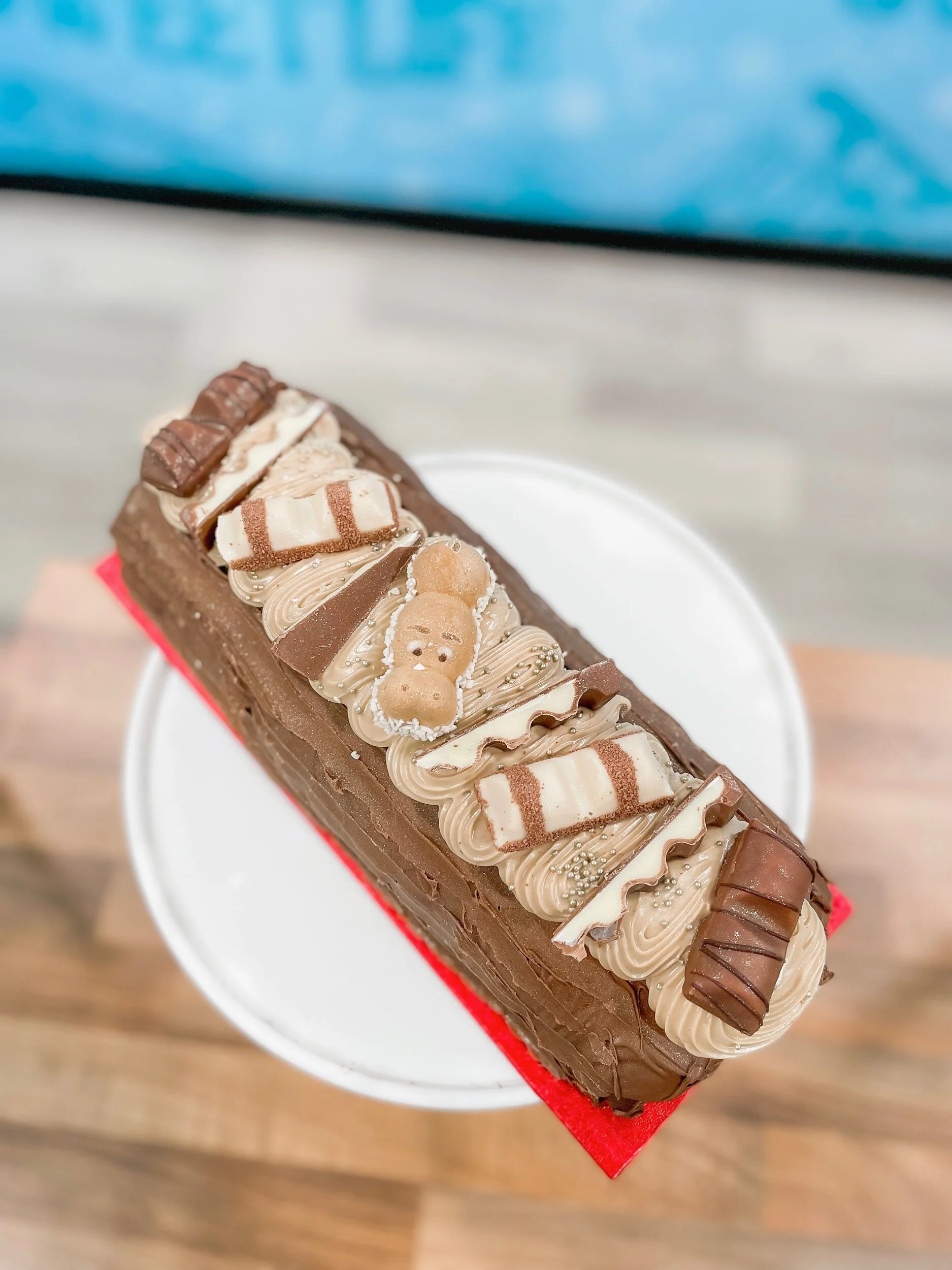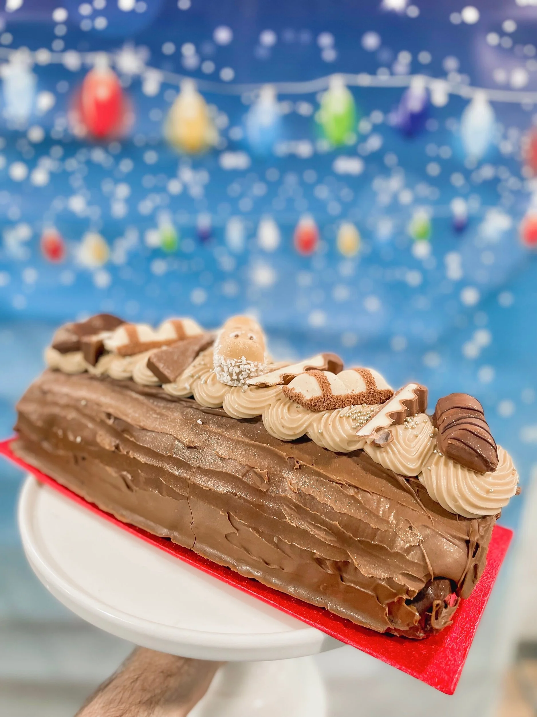 Our brownie yule log comes filled with your choice of flavouring, enrobed in a layer of milk chocolate ganache and topped with frosting and sprinkles!
